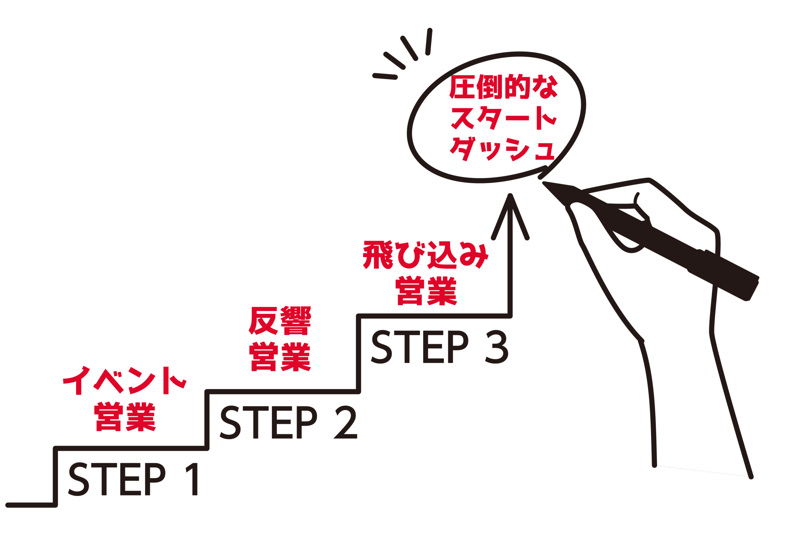 次のステップは「反響営業」です。チラシやDMを見て興味を持ったお客様からの問い合わせに対応する営業で、すでに興味関心のある方へのアプローチなので提案のしやすさがあります。