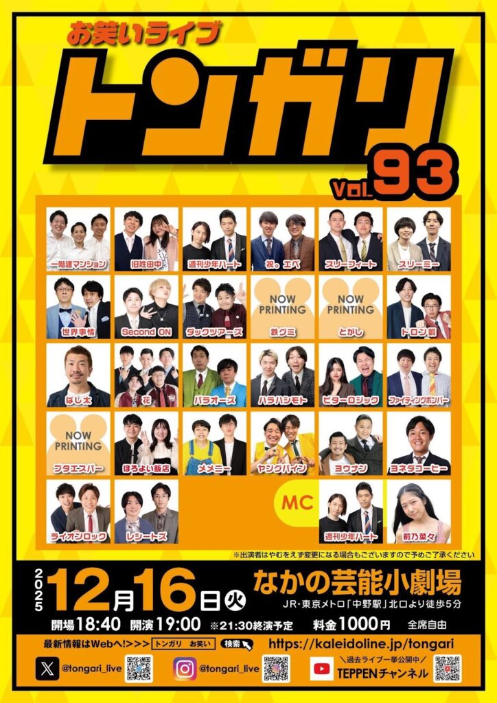2025年12月16日(火)に中野で開催されるお笑いライブイベント 「トンガリ vol.93」!