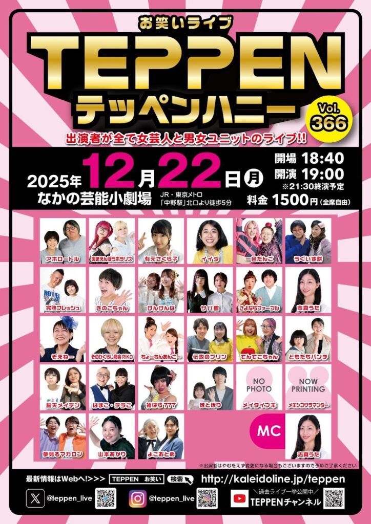 2025年12月22日(月)になかの芸能小劇場にて開催されるお笑いライブ「TEPPEN テッペンハニー vol.366」!
